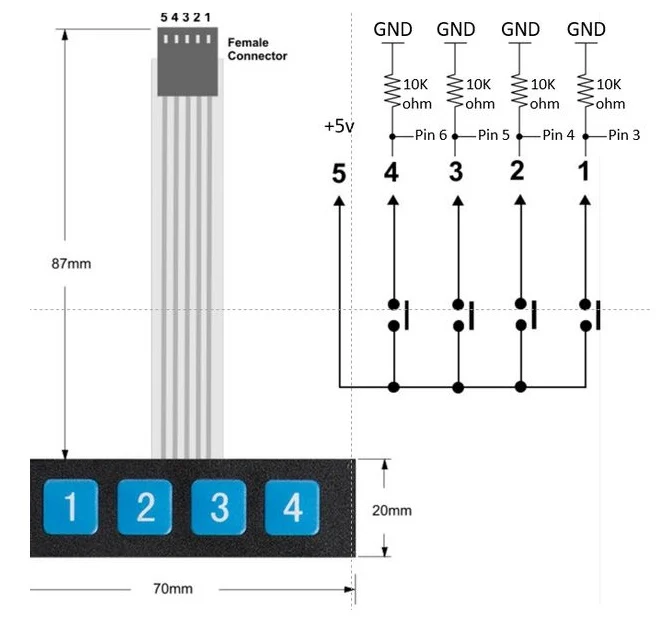 Bàn Phím Mềm 1x4 Phím có thiết kế nhỏ gọn, dễ kết nối và sử dụng, bàn phím có 1 chân chung để nối VCC hoặc GND, các chân còn lại sẽ xuất tín hiệu tương ứng với chân chung này khi có thao tác nhấn phím, phù hợp cho các ứng dụng điều khiển bằng phím bấm.