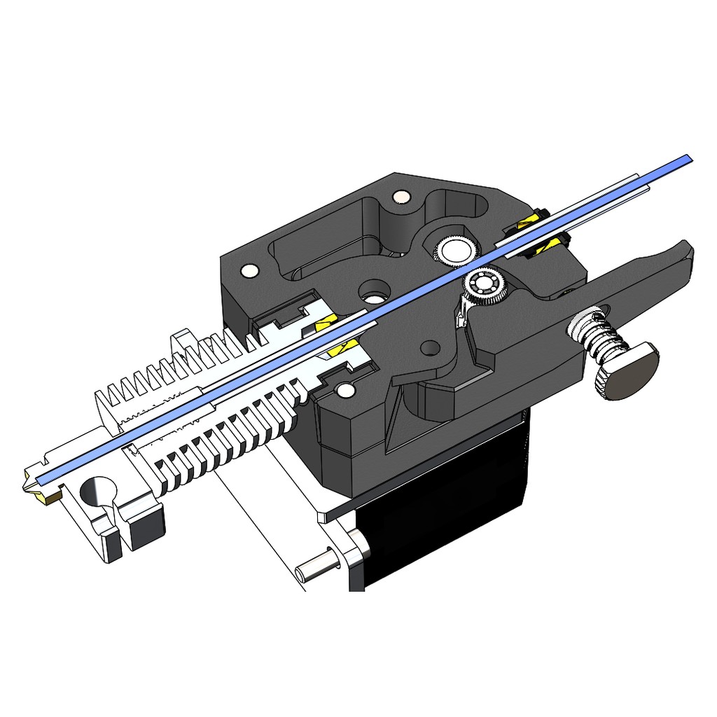 Sử dụng cơ cấu đùn bánh răng kép giúp hạn chế tối đa lỗi trượt nhựa và trào ngược sợi nhựa. Giúp giảm thiếu rủi ro kẹt nhựa do sai số của sợi nhựa, tăng sức mạnh cho động cơ đùn nhờ chạy bánh răng với tỉ số truyền 3:1 nên bạn hoàn toàn có thể sử dụng động cơ step loại nhỏ để chạy hệ thống đùn trực tiếp.