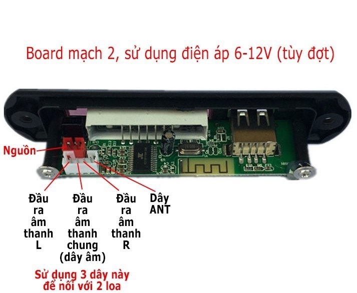 Bộ Mạch Giải Mã Âm Thanh MP3-FM Kết Nối Bluetooth-USB-Thẻ TF 12V được thiết kế với mặt nạ đi kèm. Ngõ ra âm thanh có 3 chế độ: thẻ nhớ, USB, bluetooth. Trên board được tích hợp nút nhấn để chuyển bài, tăng giảm âm lượng, phát/dừng và nút chuyển chế độ.