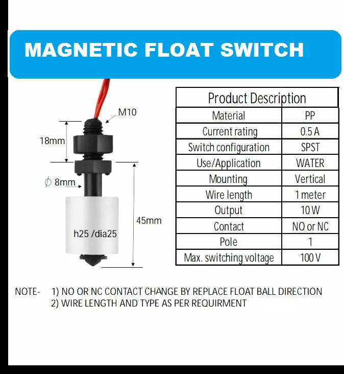 Cảm biến mực chất lỏng phao điện từ magnetic float water level sensor là loại công tắc từ, bình thường hai tiếp điểm của phao khi hướng xuống sẽ ở trạng thái đóng (NC), khi có mực chất lỏng làm phao nổi lên sẽ chuyển thành trạng thái mở (NO), dựa vào đặc tính này phao điện từ được sử dụng cho các ứng dụng: cảnh báo mực chất lỏng, báo đầy,...