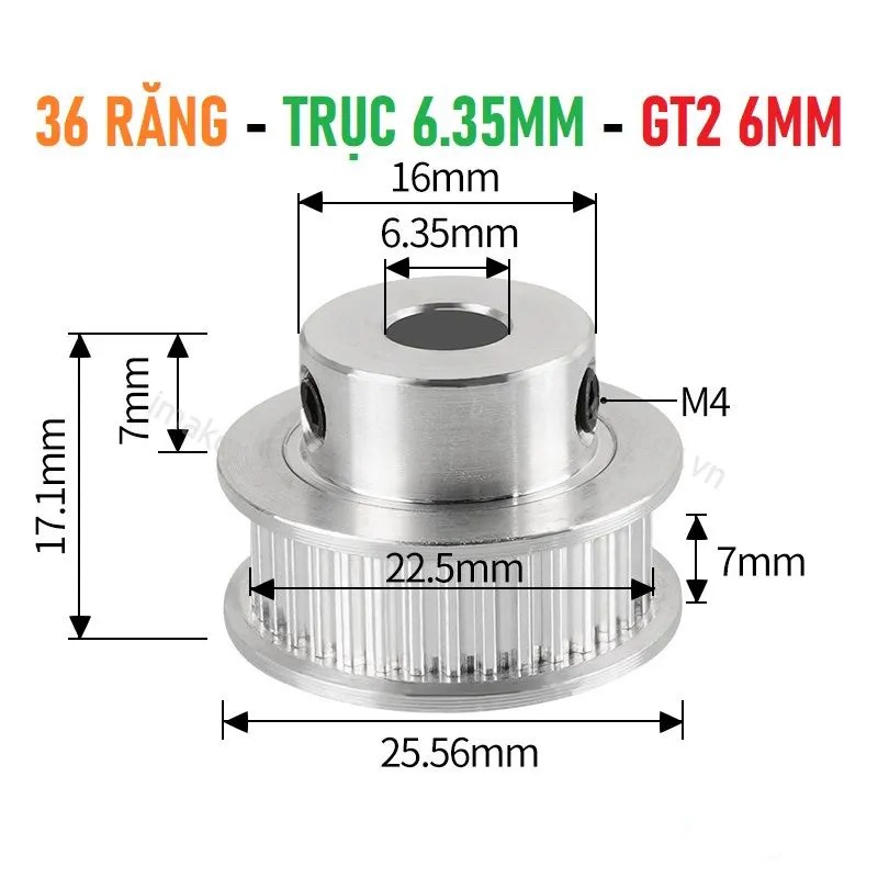 Pulley GT2 36 răng bản 6mm trục 6.35mm thường được sử dụng trong các hệ thống truyền động yêu cầu độ chính xác cao và hiệu suất ổn định, như trong máy in 3D, máy CNC, và các thiết bị tự động hóa. Thiết kế của pulley giúp giảm ma sát, tiếng ồn, và cải thiện hiệu quả truyền động của hệ thống.