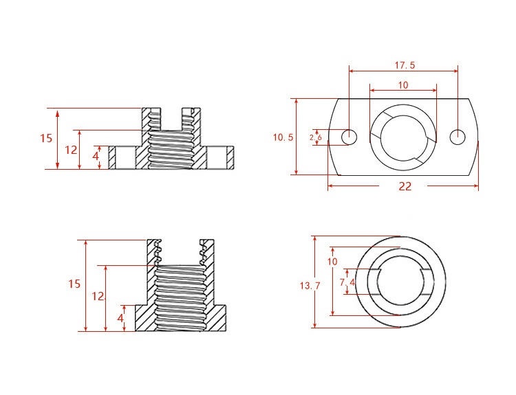 Đai ốc chống rơ trượt Vít me T8 bước 8 loại 4 rãnh xoắn là một loại đai ốc có ren tiêu chuẩn T8 với bước ren là 8mm. Nó được sử dụng để khóa chặt vít me T8 tại một vị trí nhất định. Đai ốc này có hình dạng trụ tròn, với ren ở bên ngoài. Trên đầu đai ốc có một lỗ để có thể dùng cờ lê hoặc dụng cụ tương tự để vặn chặt.