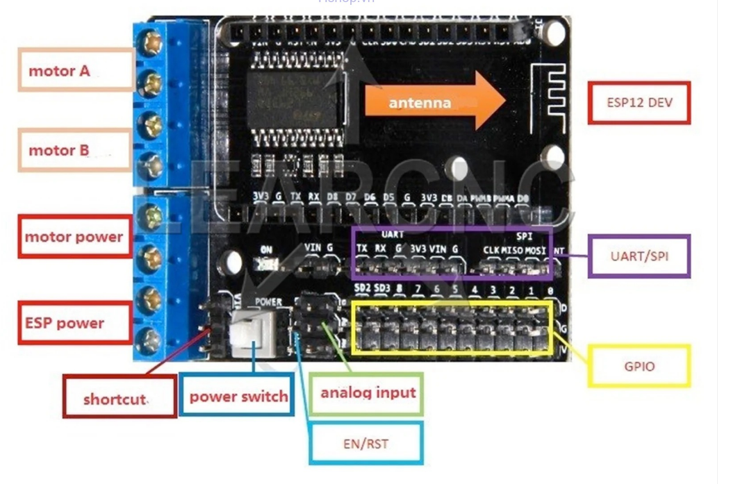 Đế ra chân ESP8266 NodeMCU Lua Motor Driver L293D được thiết kế tương thích với phiên bản NodeMCU Lua ESP8266 bao gồm phần PinOut, công tắc và Driver điều khiển động cơ L293D giúp bạn có thể dễ dàng xây dựng các ứng dụng robot điều khiển qua Wifi trên ESP8266.
