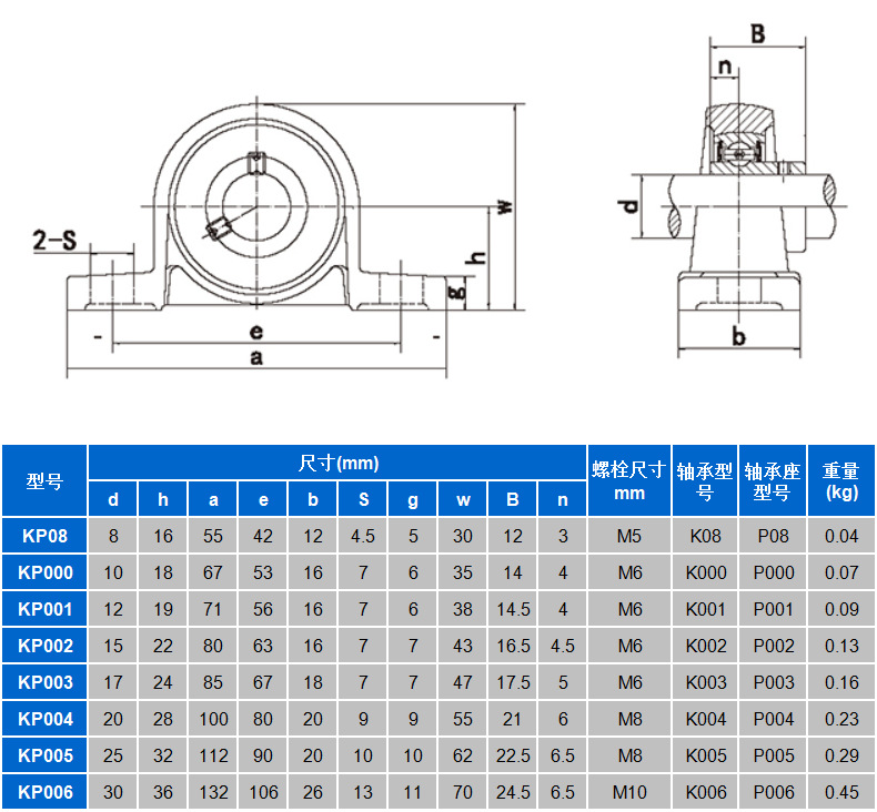 Gối đỡ đứng KP08, KP000, KP001 và KP002 là các loại gối đỡ bi cầu đơn chặn đôi, có vòng ngoài dạng trụ và vòng trong dạng đứng. Gối đỡ này được sử dụng rộng rãi trong các ứng dụng đòi hỏi độ chính xác cao, chịu tải trọng vừa phải.