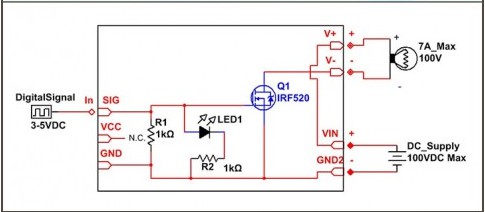 Lưu ý: Nếu tải là động cơ (tải cảm) cần gắn thêm 1 Diod ngay ngõ ra (Annot vào V-, Catot vào V+) để bảo vệ FET khỏi dòng xả ngược từ động cơ tránh gây cháy FET.