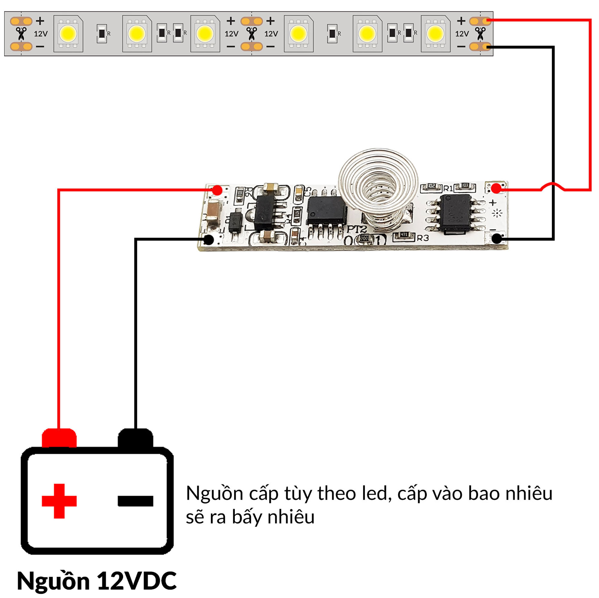 Mạch cảm ứng điện dung tích hợp dimmer LED 9-24VDC cho điện áp đầu ra bằng điện áp đầu vào, vì vậy cần chọn đúng loại điện áp tương ứng với loại led. Module này giống như 1 công tắc cảm ứng điện dung, đóng mở led trực tiếp mà không cần qua relay (dòng tối đa 3A).
