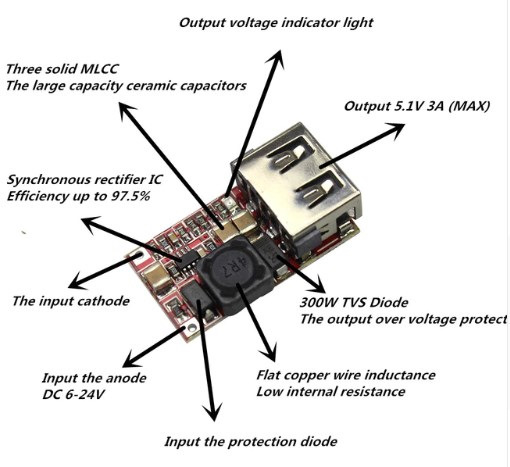 Mạch Ổn Áp 5V 3A Ra USB Type A có điện áp đầu vào từ 6V – 24V cho đầu ra 5V dòng từ 2A – 3A, tích hợp tụ điện chống nhiễu an toàn, cho hiệu suất lên tới 97%.