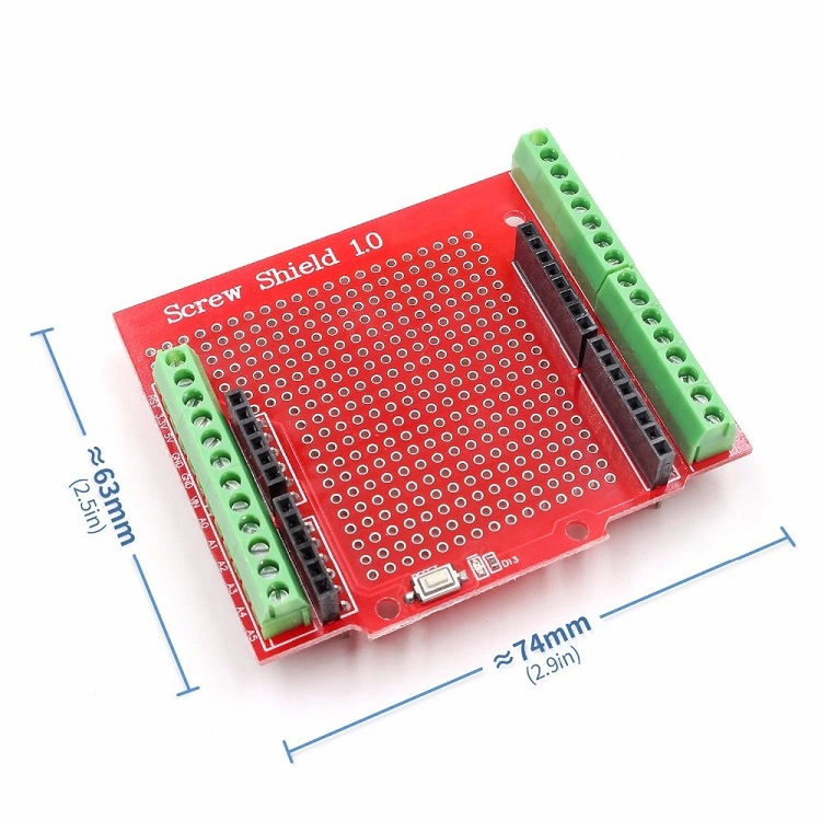 Mạch Proto Screw Shield (Arduino Compatible) được sử dụng để hàn các linh kiện cố định lên mạch giúp kết nối với Arduino dễ dàng và linh hoạt, ngoài ra khác với Arduino Proto Shield, Arduino Proto Screw Shield được bổ sung các chân kết nối Domino giúp kết nối dây điện với các chân của Arduino bằng cách vặn ốc (screw) một cách dễ dàng và chắc chắn, phù hợp cho nhiều mục đích khác nhau.
