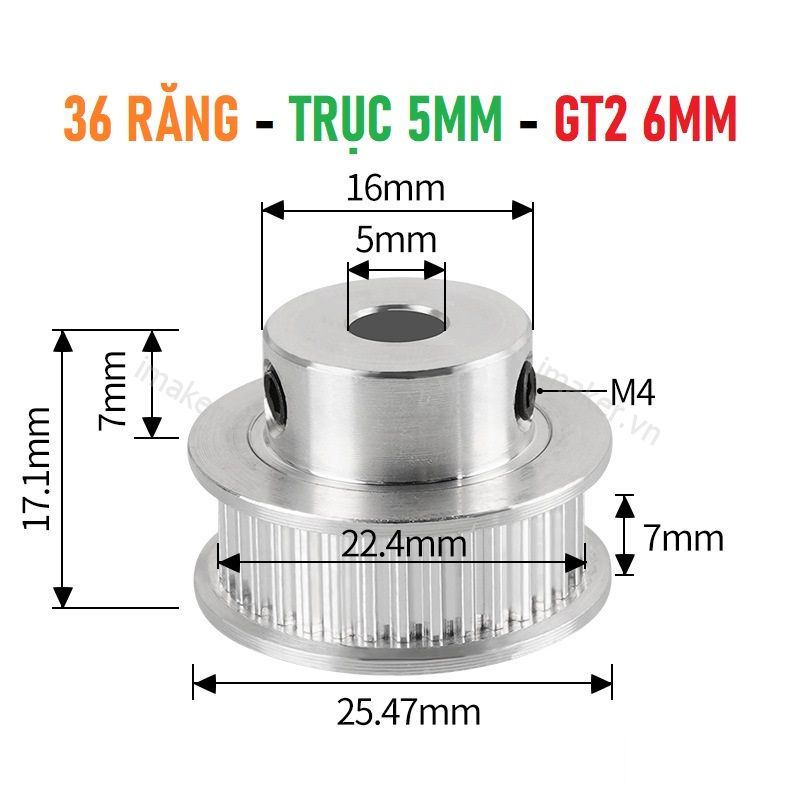 Pulley GT2 36 răng bản 6mm trục 5mm thường được sử dụng trong các hệ thống truyền động yêu cầu độ chính xác cao và hiệu suất ổn định, như trong máy in 3D, máy CNC, và các thiết bị tự động hóa. Thiết kế của pulley giúp giảm ma sát, tiếng ồn, và cải thiện hiệu quả truyền động của hệ thống.