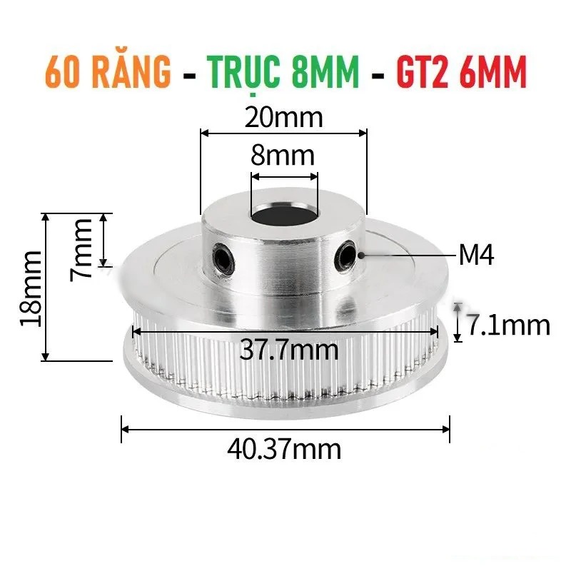 Pulley GT2 60 răng bản 6mm trục 8mm thường được sử dụng trong các hệ thống truyền động đai yêu cầu sự chính xác cao và hiệu suất ổn định. Nó là lựa chọn lý tưởng cho máy in 3D, máy CNC, và các thiết bị tự động hóa khác, giúp giảm ma sát, tiếng ồn và cải thiện hiệu quả truyền động tổng thể.