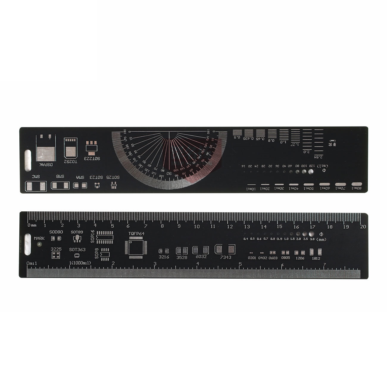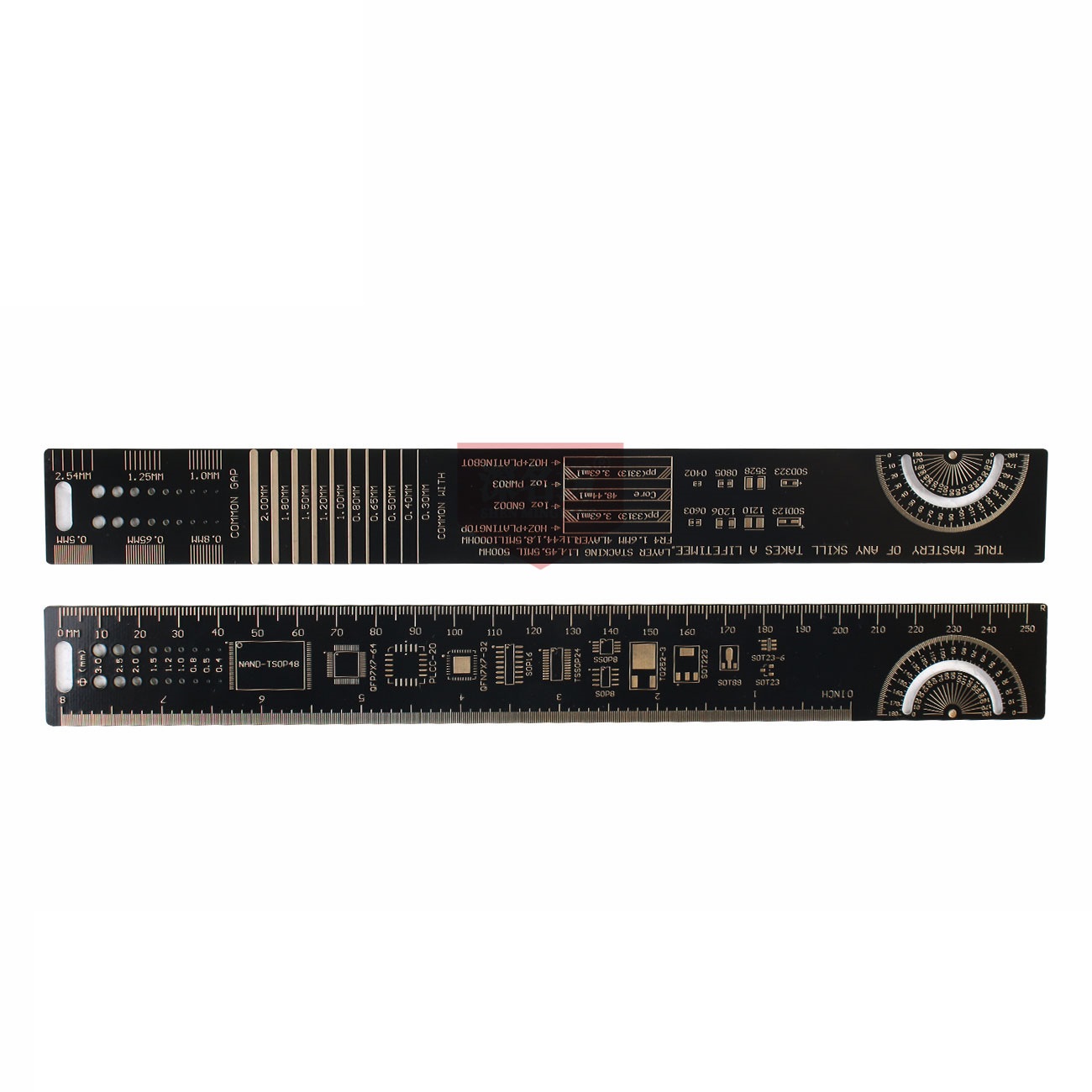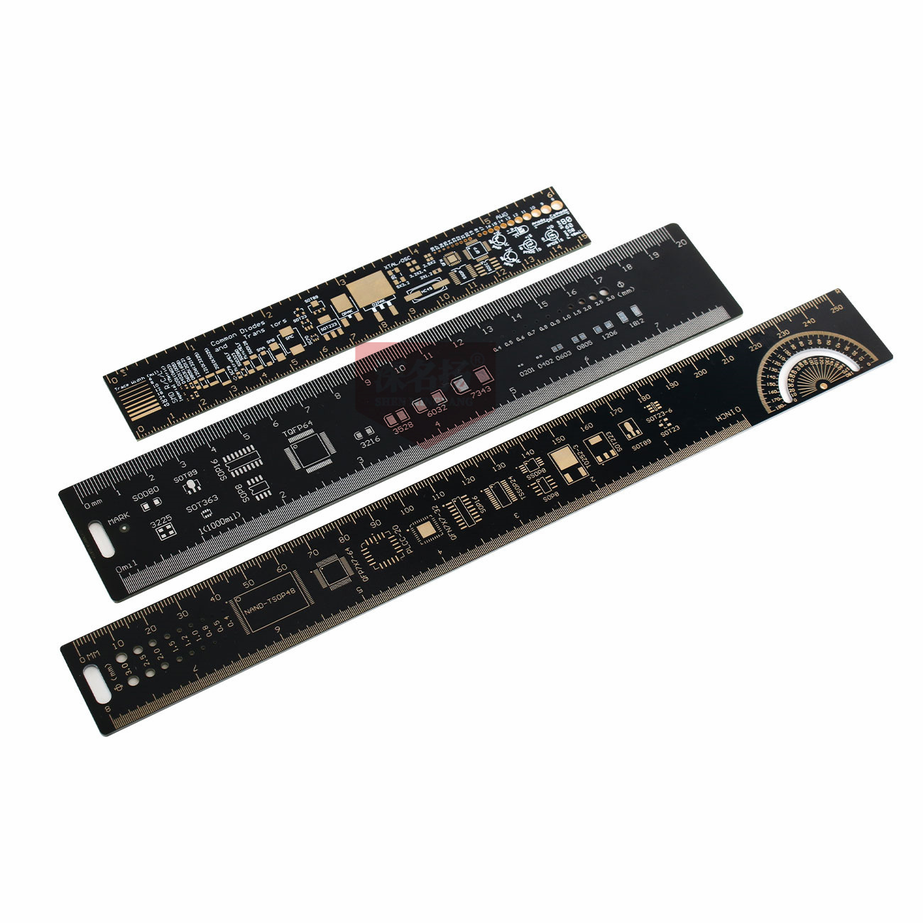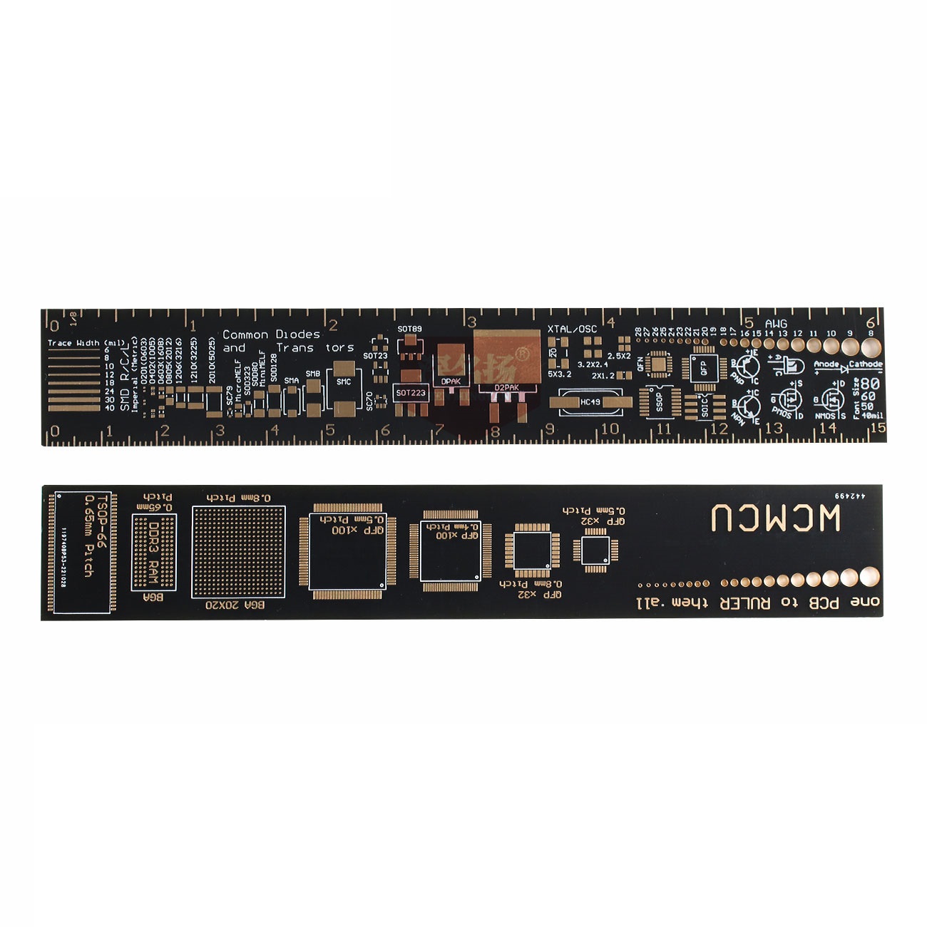 Thước đo mạch điện PCB không đơn giản như những chiếc thước kẻ bình thường vì trên nó là vô số các kiểu chân của các loại linh kiện điện tử khác nhau, có thể dùng để đo chân linh kiện, kích thước mũi khoan, đo góc... Thước đo được làm bằng PCB hai lớp mạ vàng rất đẹp, là công cụ biểu tượng cho các bạn học chuyên ngành điện tử.