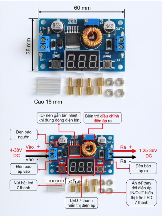 Mạch giảm áp DC XL4015 có hiển thị 5A sử dụng phương pháp giảm áp xung để giảm áp DC với dòng đầu ra lên đến 5A, mạch có tích hợp LED 7 đoạn 3 số và phím chức năng lựa chọn hiển thị áp đầu vào và đầu ra để tiện theo dõi.